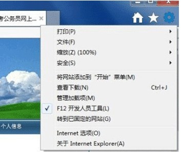 首先:請考生先選擇使用IE瀏覽器,然后選擇IE瀏覽器的兼容模式進(jìn)行網(wǎng)上報(bào)名,不同版本的IE瀏覽器兼容性模式設(shè)置方法不同,現(xiàn)以IE10為例:選擇IE10瀏覽器的工具選項(xiàng),然后選擇F12開發(fā)人員工具選項(xiàng),如下圖所示