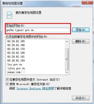 接著把天津市公務(wù)員報(bào)名的網(wǎng)站添加到兼容性視圖網(wǎng)站中去,如下圖所示