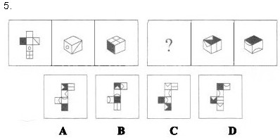 5.B【解析】本題屬于空間重構(gòu)類,主要考察了雙面之間的相對關(guān)系和相鄰關(guān)系。第一組圖形中,第一個圖形是平面圖形,第二個、第三個圖形是該圖形的折疊圖形;第二組圖形中,根據(jù)第二個折疊圖形中黑底白三角特正面和白底白三角特征面之間的相鄰關(guān)系,公共邊是白底白三角的底邊,所以排除A、D選項;根據(jù)第二個折疊圖形橫線特征面與黑底白三角特征面之間也是相對關(guān)系,而直線平行于底白三角特征面對稱軸方向,C選項中方向為垂直,所以排除C選項。因此,本題選擇B選項。