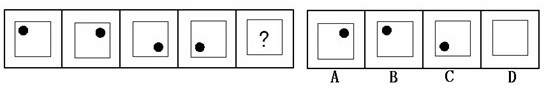 (答案:B。黑點(diǎn)在正方形中順時(shí)針移動(dòng)。在第5個(gè)圖形中,應(yīng)該正好移動(dòng)到左上角。)