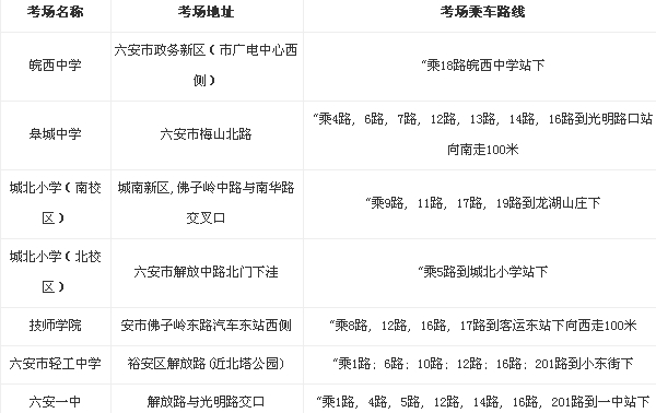 2014年安徽省公務(wù)員考試六安考區(qū)考點(diǎn)公布如下: