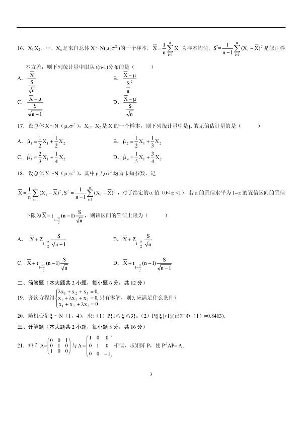 07年1月高等教育自學(xué)考試高等數(shù)學(xué)(二)試題