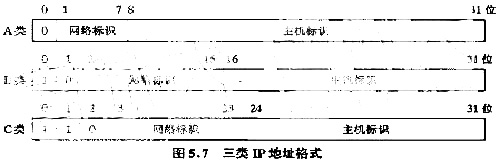 IP地址由32位(即4字節(jié))二進制數(shù)組成,為書寫方便起見,常將每個字節(jié)作為一段并以十進制數(shù)來表示,每段間用?!??!狈指?。例如,202.96.209.5就是一個合法的IP地址。IP地址由網(wǎng)絡(luò)標(biāo)識和主機標(biāo)識兩部分組成。常用的IP地址有A、B、C三類,每類均規(guī)定了網(wǎng)絡(luò)標(biāo)識和主機標(biāo)識在32位中所占的位數(shù)。這三類IP地址的格式如圖5.7所示,