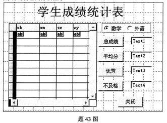 43.下圖的學(xué)生成績(jī)統(tǒng)計(jì)表界面可以分別統(tǒng)計(jì)數(shù)學(xué)(SX)和外語(WY)的各項(xiàng)數(shù)據(jù),每個(gè)按鈕對(duì)象都有自己的方法程序。