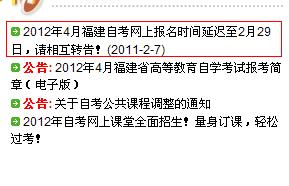 2012年4月福建自考網(wǎng)上報(bào)名時(shí)間延遲至2月29日,請相互轉(zhuǎn)告