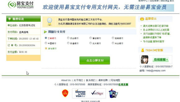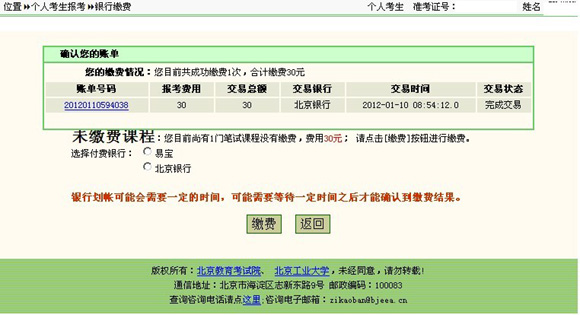 1、考生在此處選擇繳費方式,是使用易寶支付,還是北京銀行。