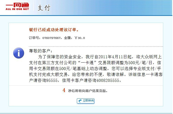 4、以下為考生通過招商銀行繳費成功后,返回易寶支付的畫面