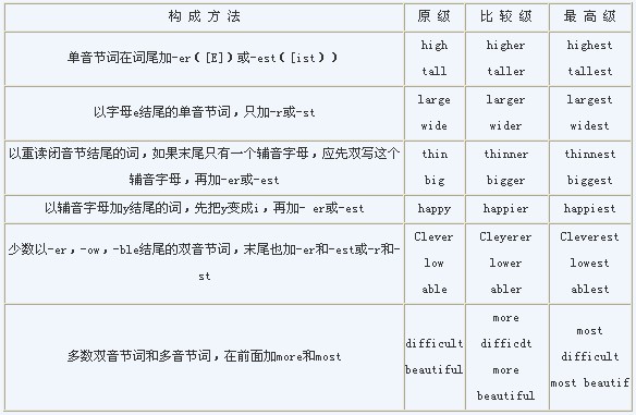 規(guī)則變化:一般在單音節(jié)和部分雙音節(jié)的形容詞的詞尾加-er或-esto大部分雙音節(jié)和多音節(jié)的形容詞,則在其前面加more或most.