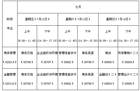 上海市2013年7月自考中英合作專業(yè)考試安排表