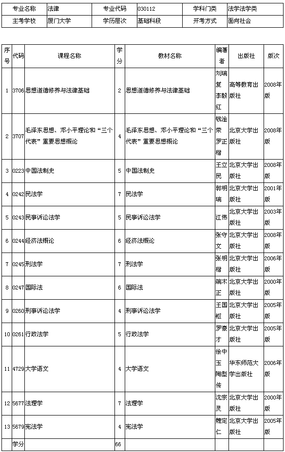 福建省2013年廈門大學(xué)自考法律(基礎(chǔ)科段)考試計(jì)劃