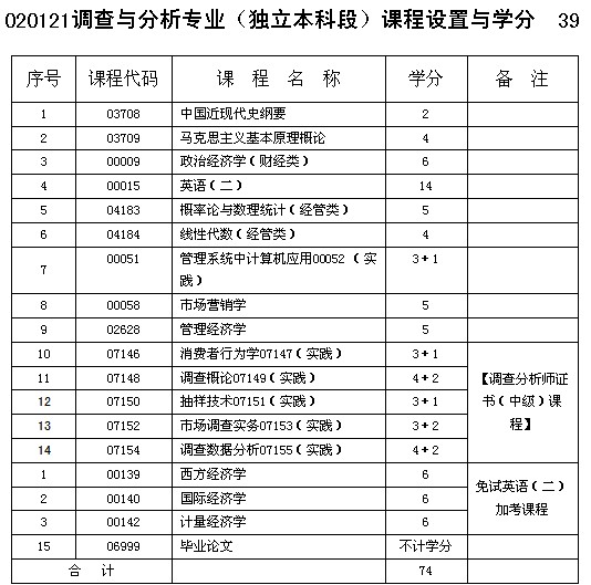 重慶市自考調(diào)查與分析專業(yè)(獨立本科段)課程設(shè)置與學分