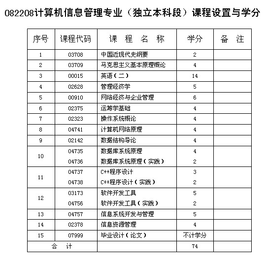 重慶市自考計(jì)算機(jī)信息管理專業(yè)(獨(dú)立本科段)課程設(shè)置與學(xué)分