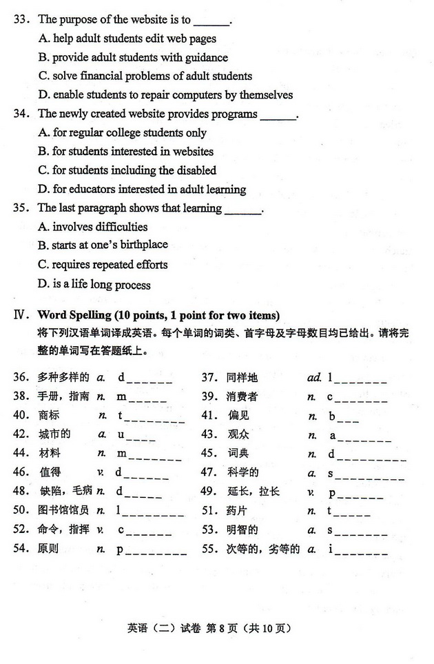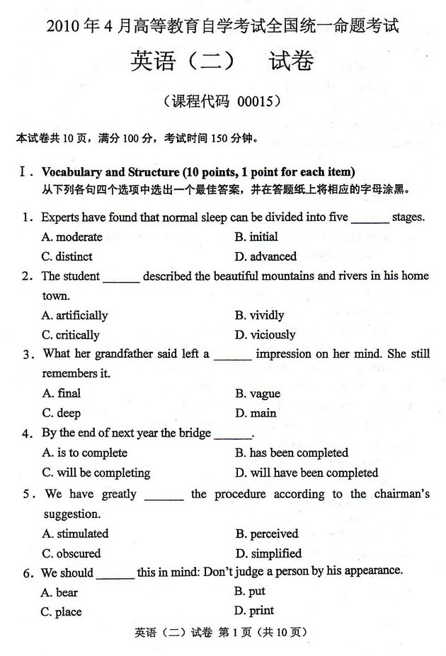 摘要 全國2010年4月自考英語(二)真題,由環(huán)球網(wǎng)校自考頻道為您提供!