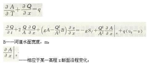 河道非恒定流常用一維圣維南方程描述。河道有側(cè)向人流時(shí),基本方程為: