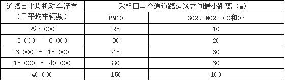 (八)對(duì)于空氣質(zhì)量評(píng)價(jià)點(diǎn),應(yīng)避免車輛尾氣或其他污染源直接對(duì)監(jiān)測(cè)結(jié)果產(chǎn)生干擾,點(diǎn)式儀器采樣口與道路之間最小間隔距離應(yīng)按下表的要求確定: