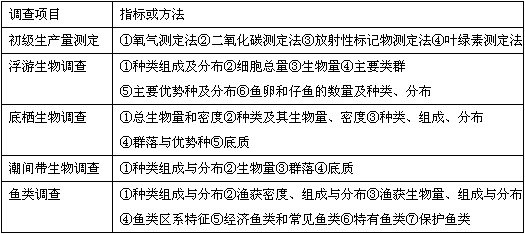 初級(jí)生產(chǎn)量、浮游生物、底棲生物、游泳生物和魚類資源等,有時(shí)還有水生植物調(diào)查等,見表4--13。