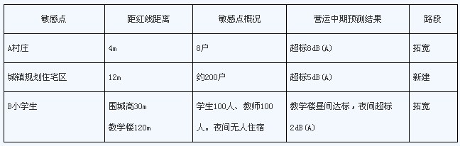 該項目沿線兩側(cè)分布有大量農(nóng)田,還有一定數(shù)量的果樹和路旁綠化帶,改建中型橋梁橋址,位于X河集中式飲用水源二級保護區(qū)外邊緣,其下游4km處為該集中式飲用水源保護區(qū)取水口。新建橋梁跨越的Y河為寬淺型河流,水環(huán)境功能類別為II類,橋梁設(shè)計中有3個橋墩位于河床,橋址下游0.5km處為某魚類自然保護區(qū)的邊界。公路沿線分布有村莊、學校等,其中A村莊、B小學和某城鎮(zhèn)規(guī)劃住宅區(qū)的概況及公路營運中期的噪聲預測結(jié)果見下表: