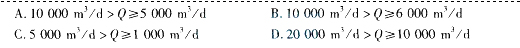 20、根據(jù)地面水環(huán)境影響評(píng)價(jià)中污水量的分級(jí)判據(jù),第三個(gè)等級(jí)的范圍是( )。