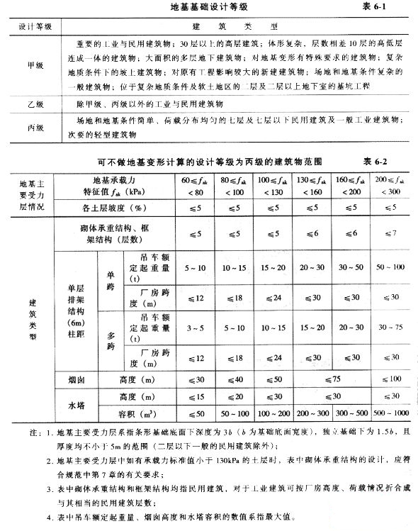 3.表6-1所列范圍內(nèi)設(shè)計(jì)等級(jí)為丙級(jí)的建筑物oJ不做變形驗(yàn)算,如有下列情況之一時(shí),仍應(yīng)做變形驗(yàn)算: