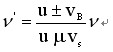 設(shè)波源、觀測者的運動發(fā)生在二者連線上。若波源的頻率為u,波在介質(zhì)中傳播速度 為U,觀測者相對介質(zhì)運動的速度為vB (按近波源為正,背離波源為負(fù)) ,波源、相對介質(zhì) 的運動速度為Vs (接近觀測者為正,背離觀測者為負(fù)) ;觀測者接收到的頻率為ν’。有
