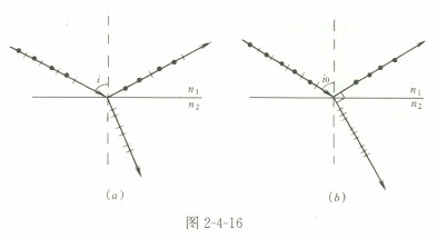 如圖2-4-16 (α)所示,自然光以入射角i自折射率為n1的介質(zhì)射向折射率為n2的介 質(zhì)界面。將自然光以入射面(由入射線與兩種介質(zhì)分界面的法線所組成的平面)為基準, 正交分解為垂在于人射面的光振動(以·表示)和平行于入射面的光振動(以|表示)。 在分界面上反射的反射光為垂直于入射面的光振動較強的部分偏振光,折射光為平行于人射面的光振動較強的部分偏振光,它們的偏振程度與入射角i有關(guān)。