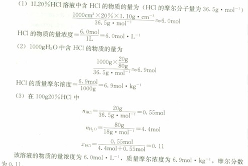【例3-2-1】 20%HCl的密度為1.10g·crn-3。試計(jì)算該溶液的物質(zhì)的量濃度、質(zhì)量摩爾濃度和摩爾分?jǐn)?shù)。