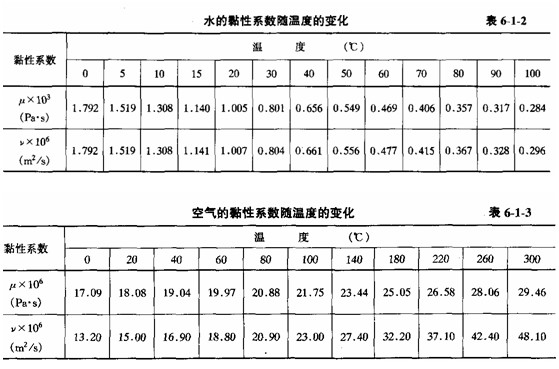 ν的單位為┫/s或C┫/s。表6-1-2和表6-1-3中列出了水和空氣的黏性系數(shù)μ和運