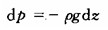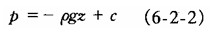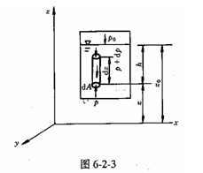 在容器中,取一圓柱體,它的水平截面積為dA(圖6-2-3),在重力作用下,水平方向因表面力大小相等,方向相反。在豎直方向,作用在底面的壓力等于p,方向向上;頂面的壓力等于p+dp,方向向下;質(zhì)量力是重力pgdzdA方向向下,各力處于平衡狀態(tài),有pdA—(p+dp)dA—pgdAdz=0,用dA遍除各項(xiàng)可得