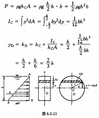壓力中心離液面水深2/3的地方,因平面是對稱的,P的作用點位于對稱軸上,在形心的下面。用圖解法可以清楚看出,其總壓力的大小為三角形ABE的面積乘上寬度b即為靜壓強分布圖的體積。作用點通過體積的形心并位于對稱軸D點,位于水面下的2h/3處。如圓形(半徑為r)鉛直平面AB左面承受水壓(圖6—2—13),通過形心軸的慣性矩