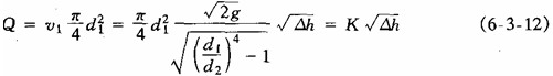 K是一個(gè)只和dl、d2及重力加速度z有關(guān)的固定常數(shù)。式(6—3—12)中沒有計(jì)及水頭損失。實(shí)際流體中存在水頭損失,因而實(shí)際通過的流量必小于理論流量。為修正這一誤差,可用文丘里流量系數(shù)μ值加以修正。根據(jù)實(shí)驗(yàn),它的值在0.95—0.98之間,則