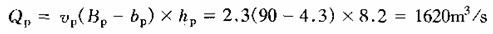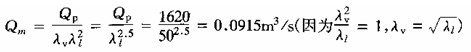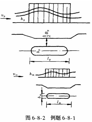 [例6—8—1] 圖6—8—2表示一橋墩長(zhǎng)lp=24m,寬bp=4.3m,水深hp=8.2m,河中水流平均流速vp=2.3m/s,兩橋臺(tái)的距離Bp=90m,取λl=50設(shè)計(jì)水工模型尺寸。試確定流量值。