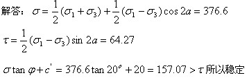 10.某一點(diǎn)的應(yīng)力狀態(tài)為σ1 =400kPa,σ3 =200kPa, c=20kPa,Φ= 20°,則該點(diǎn)處于下列(A )項(xiàng)所述情況。