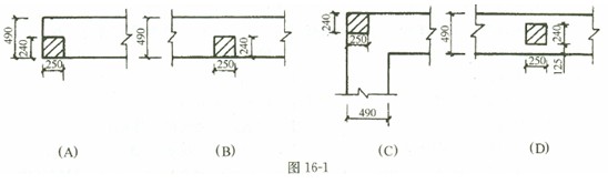 5、某截面為250mm X 240mm的鋼筋混凝土柱,支承在490mm厚磚墻上,墻用 MU10級(jí)磚、M2. 5混合砂漿砌筑,試問圖16-1中哪種情況磚墻可能最先發(fā)生局壓破壞?(A)