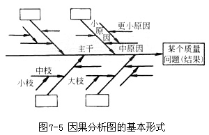 構(gòu)成――從圖7-5可見,因果分析圖由質(zhì)量特性(即質(zhì)量結(jié)果指某個(gè)質(zhì)量問題)、要因(產(chǎn)生質(zhì)量問題的主要原因)、枝干(指一系列箭線表示不同層次的原因)、主干(指較粗的直接指向質(zhì)量結(jié)果的水平箭線)等所組成