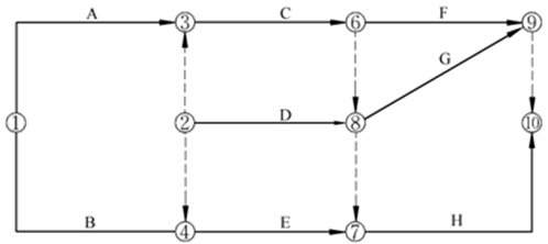 解析:A.①②節(jié)點為起點節(jié)點,起點節(jié)點的特征:只有箭尾,無箭頭射入。C.節(jié)點編號有誤,箭尾節(jié)點編號一定小于箭頭節(jié)點編號,工作8-7不符合。E.存在多余虛工作9-10。