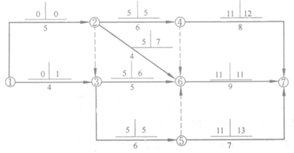 解析:A.應用標號法確定關鍵線路:1-2-3-5-6-7,1-2-4-6-7。B.工作總時差=最遲開始時間-最早開始時間。C.工作4-7最早完成時間為19,工作5-7的最早完成時間為18;計劃工期=計算工期為20,自由時差=計劃工期-最早完成時間,20-19≠20-18,因此兩項工作自由時差不相等。D.工作2-6的總時差=7-5=2;自由時差=11-(5+4)=2,因此相等。E.同理,工作3-6的總時差與自由時差相等。