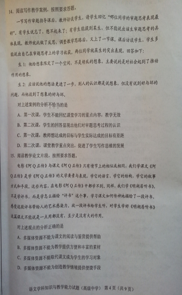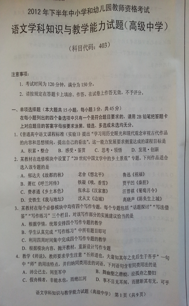 2012下半年教師資格考試《語(yǔ)文科學(xué)知識(shí)與教學(xué)能力》真題(高級(jí)中學(xué))