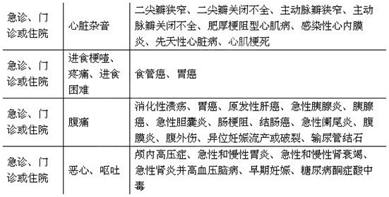 急診、門診或住院 | 嘔血與便血 | 食管癌、胃癌、急性胃炎、消化性潰瘍、 炎癥性腸病、肝硬化、門靜脈高壓癥、 結腸息肉、直腸息肉、結腸癌、直腸癌、 痔瘡、肛瘺、肛裂、傷寒 |