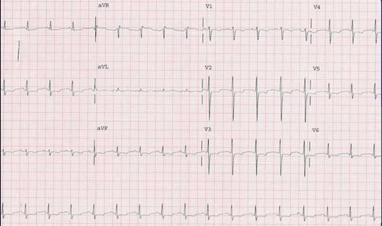 1. 一位68歲男性患者因“胸痛半小時(shí)”來(lái)到急診就診?;颊呓裨鐭o(wú)明顯誘因突然出現(xiàn)心前區(qū)悶痛,壓迫感,向左肩放射,休息有所減輕。昨日也有一次類似發(fā)作。既往高血壓病10年,服用倍他樂(lè)克控制。體檢BP160/90mmHg,心率60次/分。ECG見(jiàn)圖。