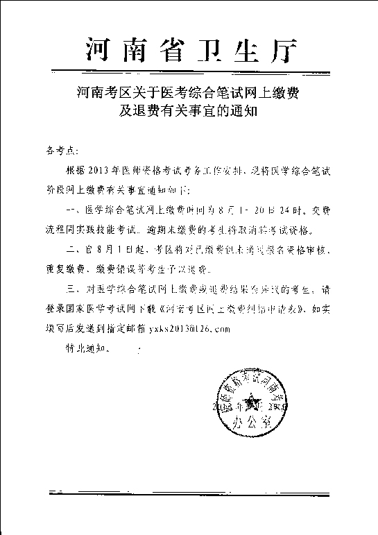河南2013醫(yī)師資格考試筆試網上繳費及退費通知
