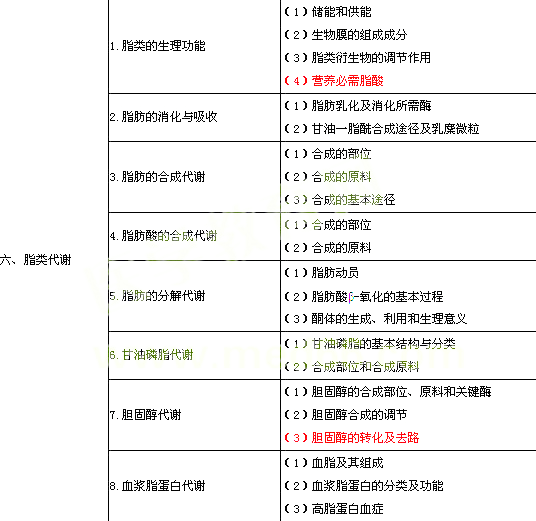 | 七、氨基酸代謝 | 1.蛋白質的生理功能及營養(yǎng)作用 | (1)氨基酸和蛋白質的生理功能 (2)營養(yǎng)必需氨基酸的概念和種類 (3)氮平衡 |