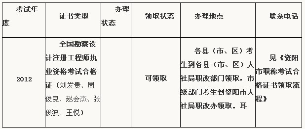 在四川人事考試網(wǎng)報(bào)名時(shí)所選考區(qū)為資陽的職稱考試合格人員(成績公布在四川人事考試網(wǎng)),請查閱下表,按《資陽市職稱考試合格證書領(lǐng)取流程》辦理證書。