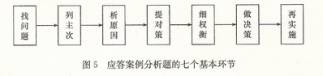 應(yīng)答案例分析題一般需要經(jīng)過七個基本環(huán)節(jié)(見圖5),可以終止于七個環(huán)節(jié)中的任意-個環(huán)節(jié)。例如,若寫到第三個環(huán)節(jié),即問題產(chǎn)生原因已找出,留給考生去做的事便是對癥下藥.在這種情況下,考生首先要提出若干可供選擇的方案或?qū)Σ撸蝗缓髮溥x方案進(jìn)行逐一權(quán)衡比較,從中找出最優(yōu)方案;最終做出正確的決策。若只指出問題,