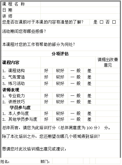 某外貿(mào)企業(yè)為提升企業(yè)的競(jìng)爭(zhēng)力,針對(duì)部分業(yè)務(wù)人員進(jìn)行了為期3天的商務(wù)禮儀培訓(xùn),希望通過(guò)培訓(xùn)使每個(gè)學(xué)員能運(yùn)用規(guī)范的商務(wù)禮儀來(lái)進(jìn)行各種商務(wù)活動(dòng),塑造良好的企業(yè)形象。培訓(xùn)結(jié)束后,人力資源部門為了解受訓(xùn)者對(duì)培訓(xùn)項(xiàng)目的感性認(rèn)識(shí),同時(shí)為將來(lái)課程的改進(jìn)收集信息,要求受訓(xùn)者填寫培訓(xùn)調(diào)查表。