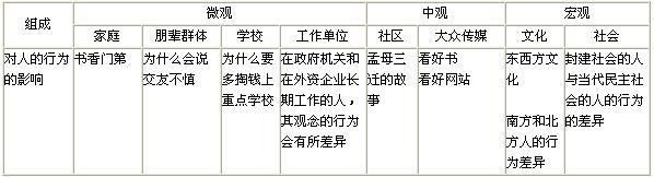 人類行為具有能動性,受到遺傳(龍生龍鳳生鳳、老鼠兒子會打洞,就是這個道理)、生理(男女、身體健康程度等)、心理(自閉型、開放性的心理導致不同的行為)及社會環(huán)境(在家庭的表現(xiàn)和在學校的表現(xiàn)會有所不同)、文化(中西方文化對擁抱的理解等)等因素的綜合影響。