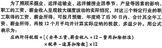 【解析】對采掘業(yè)、遠洋運輸業(yè)、遠洋捕撈業(yè)的職工工資,采取按年計算、分月預(yù)繳方 式計征個人所得稅;年度終后30日內(nèi),合計其全年工資、薪金所得,再按12月平均并計算實際應(yīng)納稅款,多退少補。在統(tǒng)一扣除1600費用的基礎(chǔ)上,準予再扣除稅法規(guī)定的附加減除費用標準。由于船員的伙食費統(tǒng)一用于集體用餐,不發(fā)給個人,故允許該項補貼不計入船員個人的應(yīng)稅工資、薪金收入。