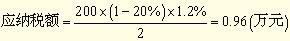 [例9-4]某廠辦公樓、廠房等房產2006年的賬面原值為200萬元,按規(guī)定房產原值扣除比率為20%,每年4月、6月分兩次繳納,則每次應繳納房產稅為: