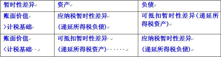 資產(chǎn)的賬面價值大于其計稅基礎,產(chǎn)生應納稅暫時性差異,計入遞延所得稅負債;資產(chǎn)的賬面價值小于其計稅基礎,產(chǎn)生可抵扣暫時性差異,計入遞延所得稅資產(chǎn)。