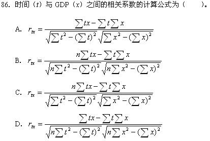 86.時(shí)間(t)與GDP(x)之間的相關(guān)系數(shù)的計(jì)算公式為( )。