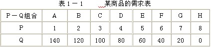 需求表所表示的是在一定時期內在各種可能的價格水平上消費者所要購買的商品數(shù)量,即商品價格(P)與需求量(Q)之間的關系。如表1-1所示。